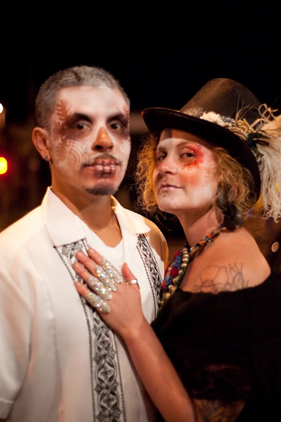 Reaching the city, I found an unusually amazing parking spot close to my destination on what seemed to be a very crowded night in the Mission for a Monday.  As I walked to our meeting place, I passed by a few people whom I thought were dressed pretty far out for even SF standards.  Capes and goth galore, it slowly dawned on me that everyone was dressing up for the Day of the Dead.  Ah yes, my birthday is also in line with hoards of people, some in costume, pilgrimaging candies and favorite foods to the grave sites of  loved ones gone the way of the Dodo.  Glad I brought my camera.